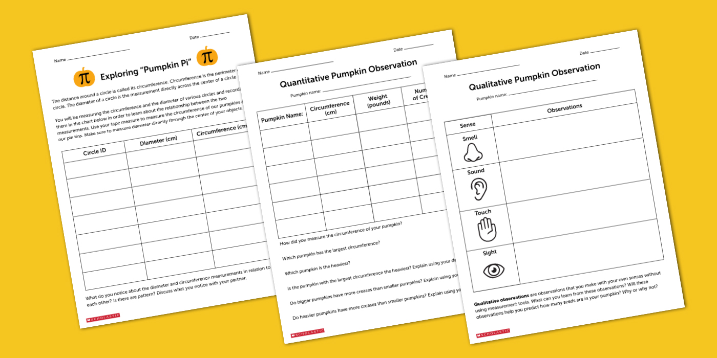 Alternatively, if you'd like, you can ask parents to sign up to donate pumpkins for the class so that everyone has their own to explore and measure, which will eliminate the need to share for safety purposes. However you tailor the following exercises for your classroom, be sure to follow your district's safety guidelines.